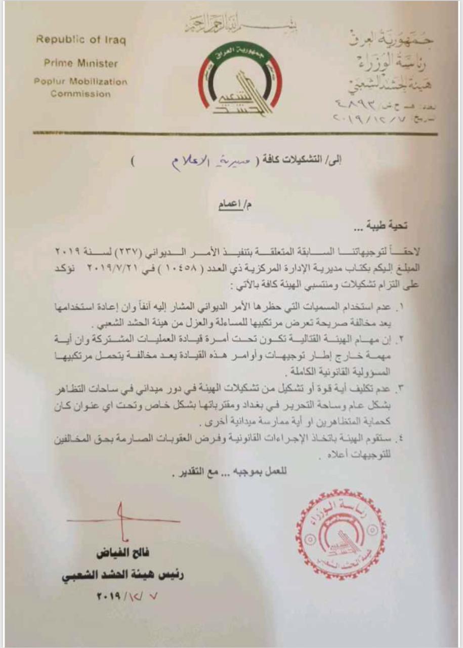 نشرت وثيقة صادرة من رئيس هيئة الحشد الشعبي فالح الفياض، بصيغة "إعمام" إلى مديرية اعلام الحشد، يخص الالتزام بالامر الديواني الذي أصدره رئيس مجلس الوزراء المستقيل عادل عبد المهدي في تموز الماضي.