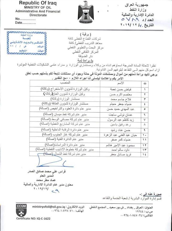 وطالبت الوثيقة الصادرة من الدائرة الادارية والمالية لوزارة النفط الى شركات القطاع النفطي ومعاهد التدريب النفطي ومراكز البحث والتطوير النفطي والمركز الثقافي النفطي بتاييد براءة ذمتهم من اموال وممتلكات الدولة في حالة وجود اي ممتلكات تابعة لهم بذمتهم واعلام الوزارة بذلك".