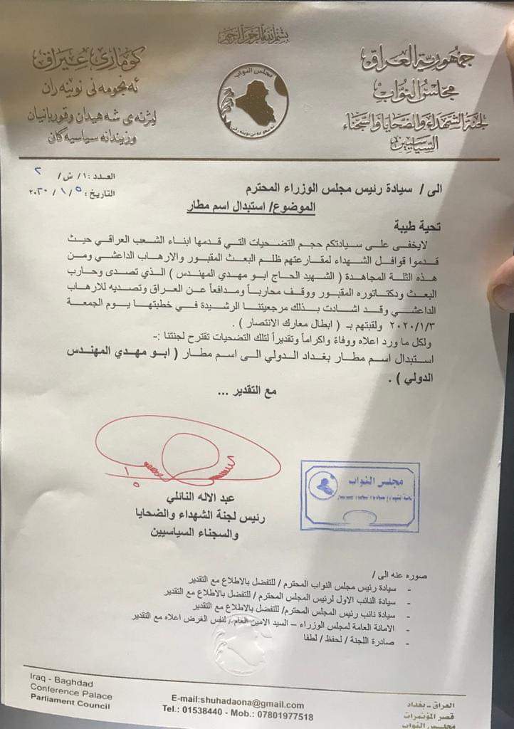 نشرت وثيقة وهي عبارة عن طلب رسمي مقدم من رئيس لجنة الشهداء والضحايا والسجناء السياسيين النيابية عبد الاله النائلي، إلى رئيس مجلس الوزراء لتغيير أسم مطار بغداد الدولي إلى مطار أبو مهدي المهندس الدولي.