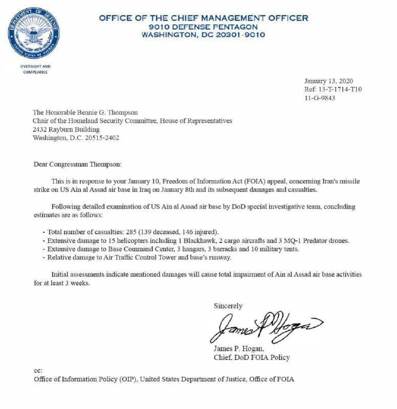 وفقا لوثيقة تم تداولها في الفضاء الإلكتروني أن السيد جيمز هوغن (من مسؤولي وزارة الدفاع الأمريكية) خلال مراسلته مع بيني تومسون (رئيس لجنة الأمن القومي بمجلس النواب الأمريكي) أعلن رسميا عن الأضرار التي لحقت بقاعدة عين الأسد.