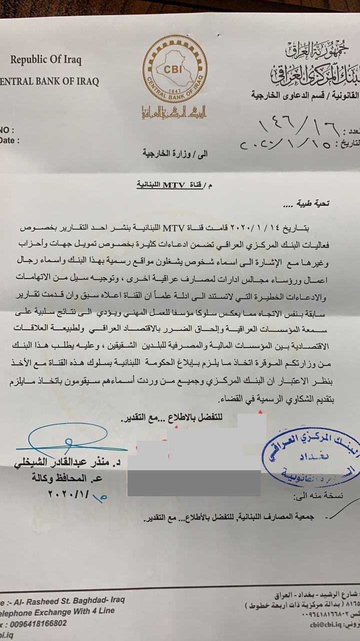بالوثيقة : البنك المركزي العراقي يطالب وزارة الخارجية تقديم دعوى ضد قناة MTV اللبنانية بسبب توجيهها اتهامات ضد البنك المركزي و مسؤولين عراقيين.