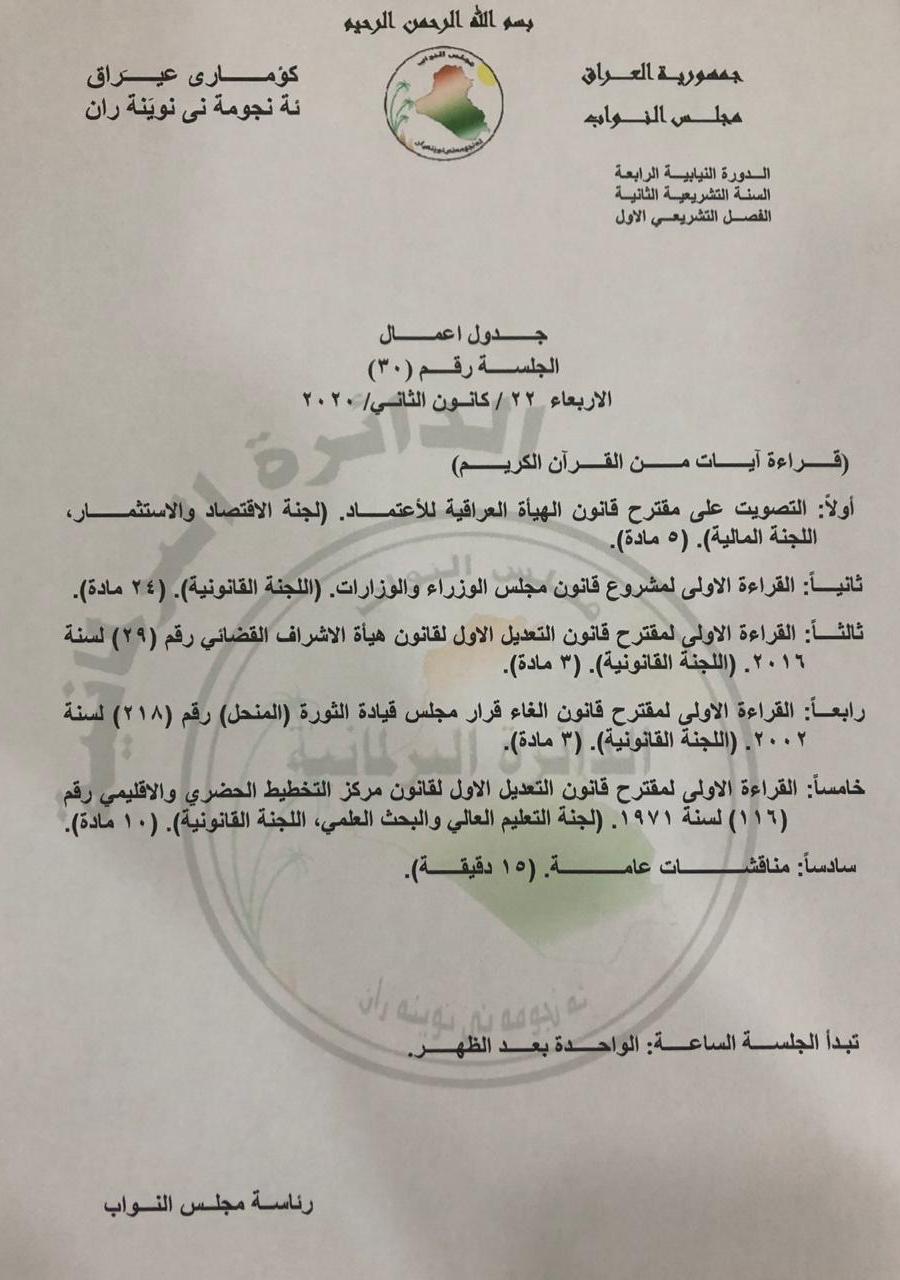 اعلن مجلس النواب، الاربعاء، عن جدول اعمال جلسته المقرر عقدها اليوم.