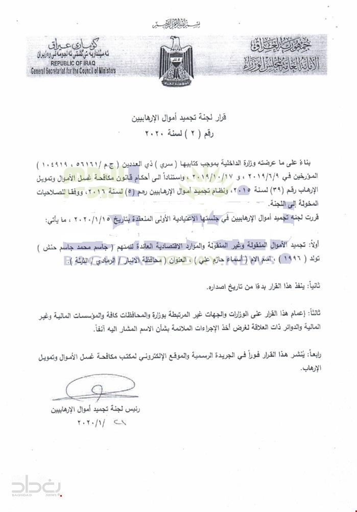 قرار بتجميد اموال عراقي بتهمة الارهاب بطلب من وزارة الداخلية