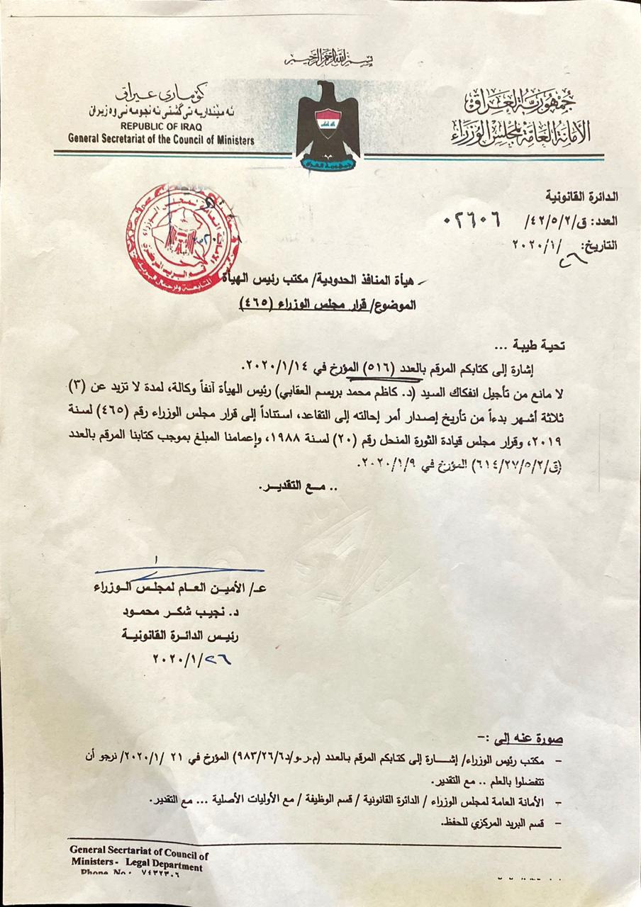 نشرت وثيقة صاردة من امانة مجلس الوزراء تتضمن موافقتها على تأجيل انفكاك رئيس هيئة المنافذ الحدودية.