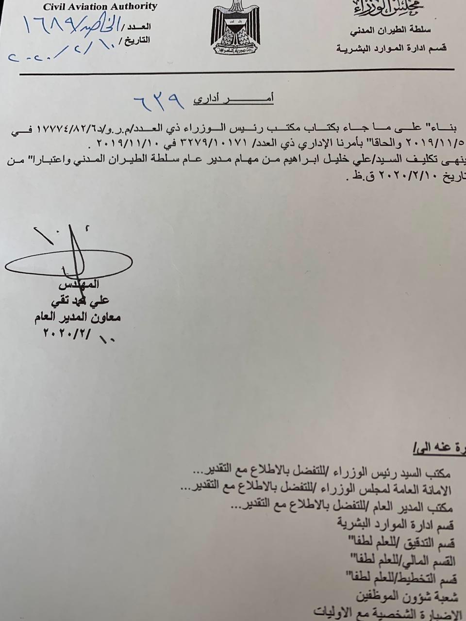 نشرت وثيقة صادر من سلطة الطيران المدني، تضمنت انهاء تكليف علي خليل ابراهيم من مهام مدير عام سلطة الطيران المدني.