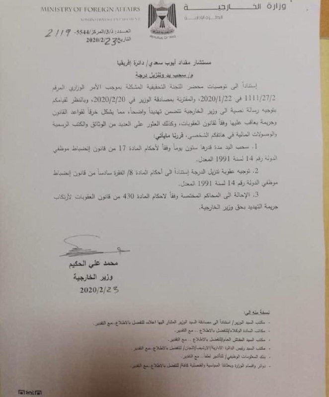 بالوثيقة : مسؤول في الخارجية يهدد الوزير والأخير يحيله للقضاء ويعاقبه وظيفياً .