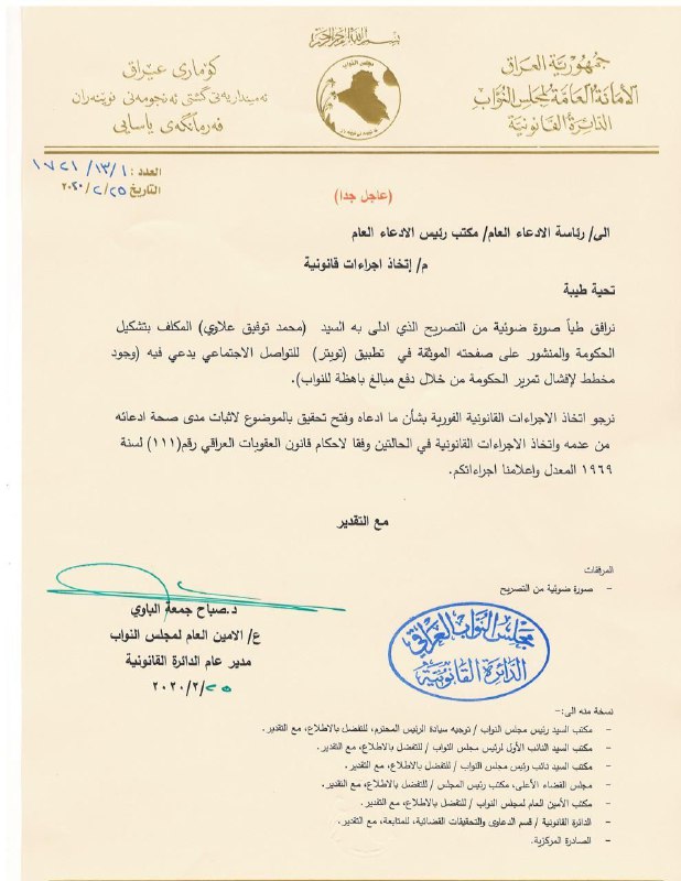 بالوثيقة كتاب مرسل من مدير عام الدائرة القانونية في مجلس النواب إلى الإدعاء العام يطلب فيه اتخاذ الإجراءات القانونية الفورية بشأن ما "أدعاه" المكلف بتشكيل الحكومة محمد توفيق علاوي بشأن وجود "مخطط لإفشال تمرير الحكومة من خلال دفع مبالغ مالية باهظة للنواب)".