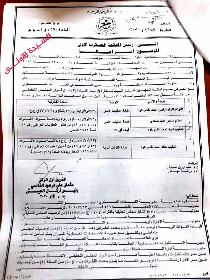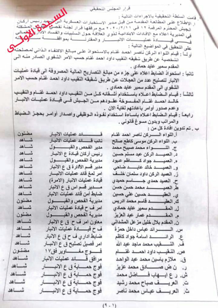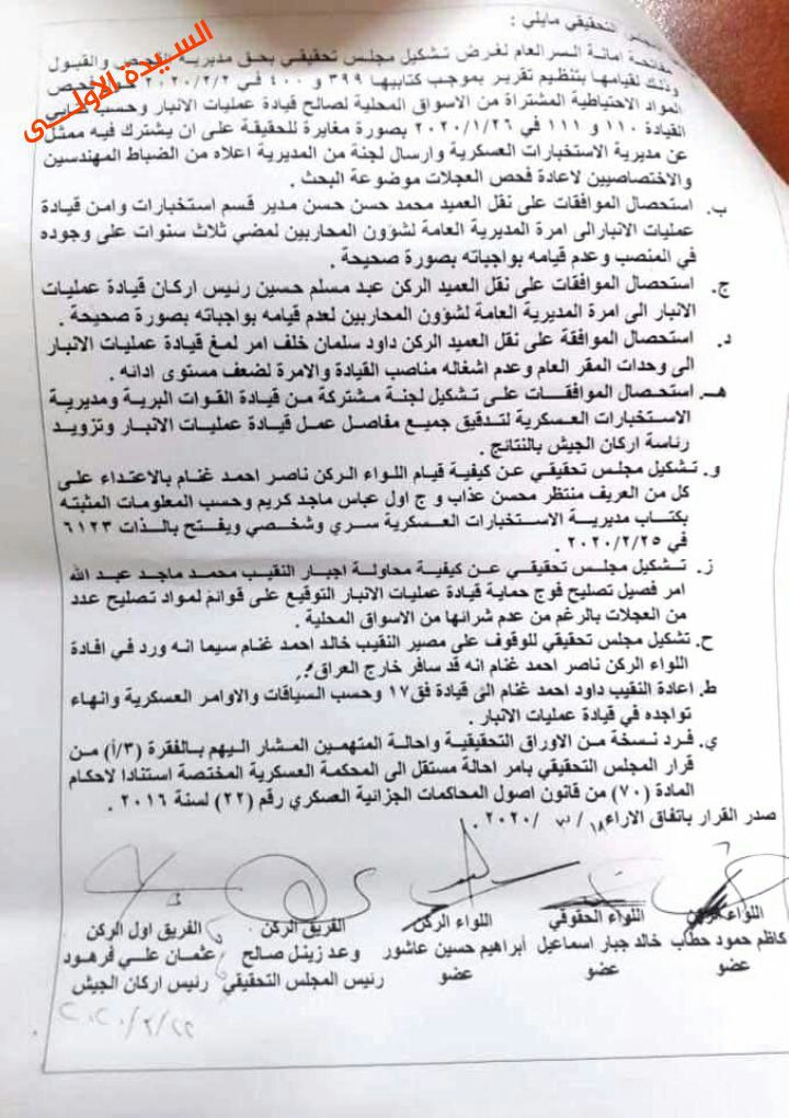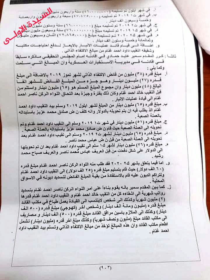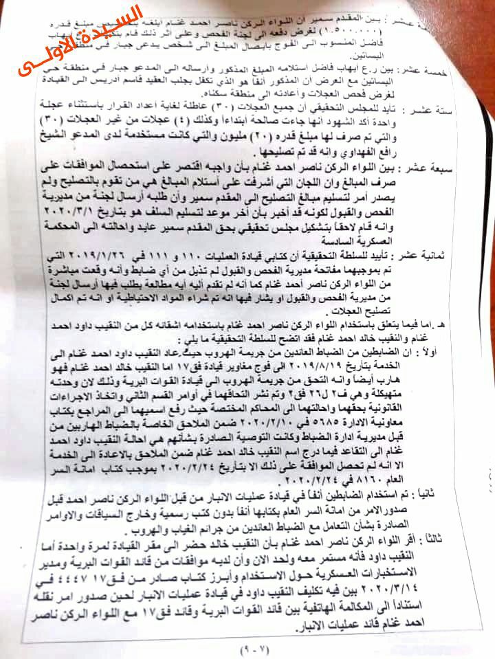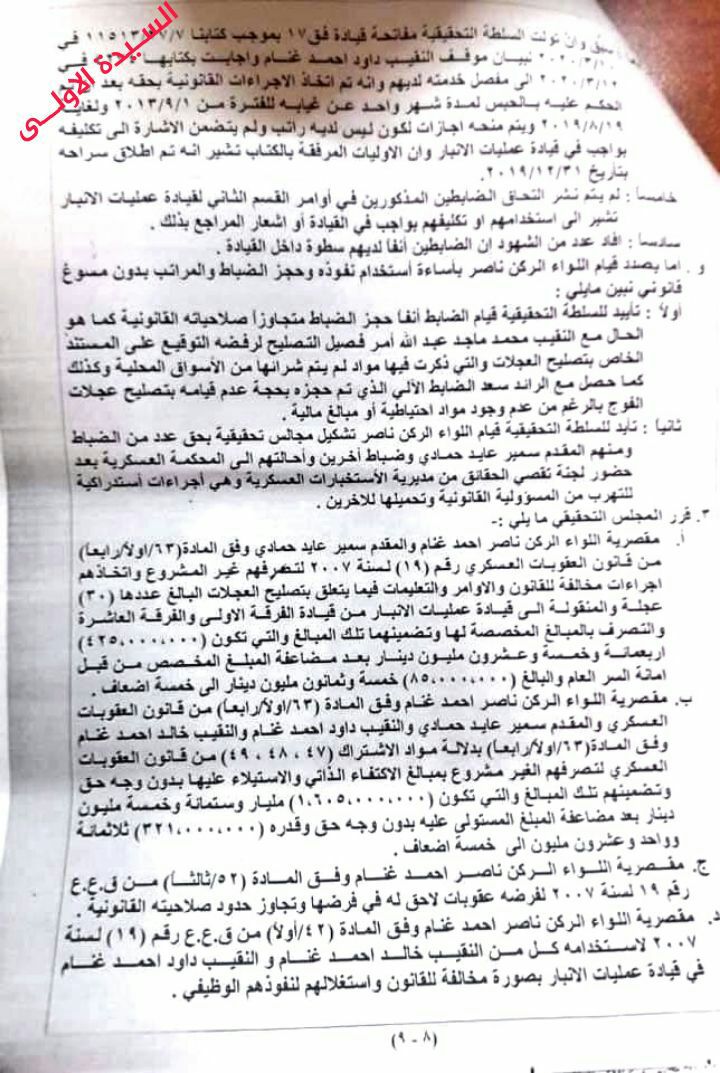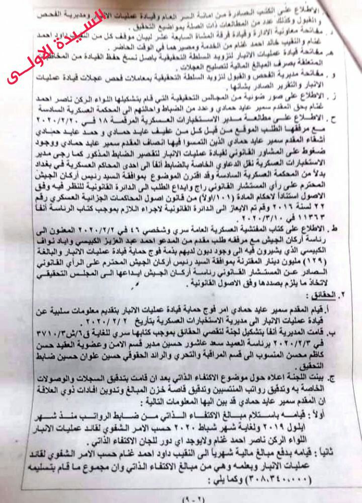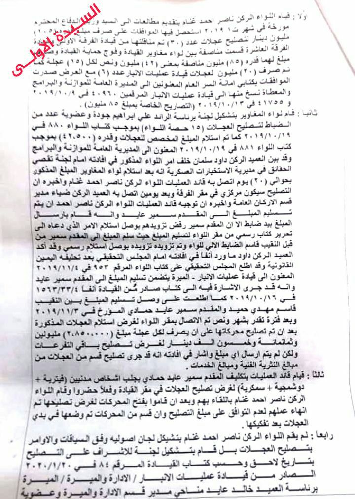 نشرت وثائق الملف التحقيقي الخاص بقائد عمليات الأنبار (اللواء الركن ناصر أحمد الغنام) وعدد من الضباط معه، والذي يكشف فضائح فساد مهولة، قاموا خلالها بنهب المليارات من أموال الشعب العراقي، واعتقالات تعسفية لمن رفضوا التعاون في تمرير صفقات الفساد، فضلا عن إعادته شقيقيه الهاربين من الخدمة ليكونا بجانبه في مطبخ الفساد.