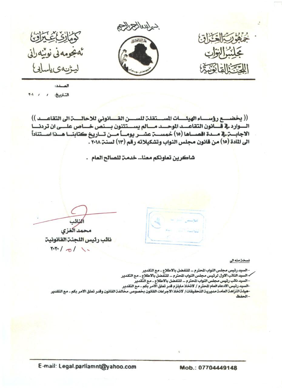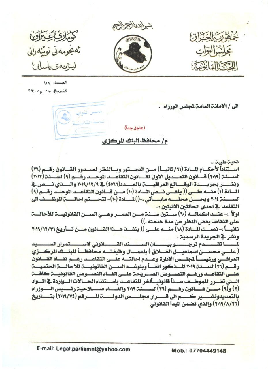 تم نشر وثائق صادرة من اللجنة القانونية البرلمانية تتضمن مخاطبة الامانة العامة لمجلس الوزراء بشأن عدم احالة محافظ البنك المركزي علي العلاق الى التقاعد.