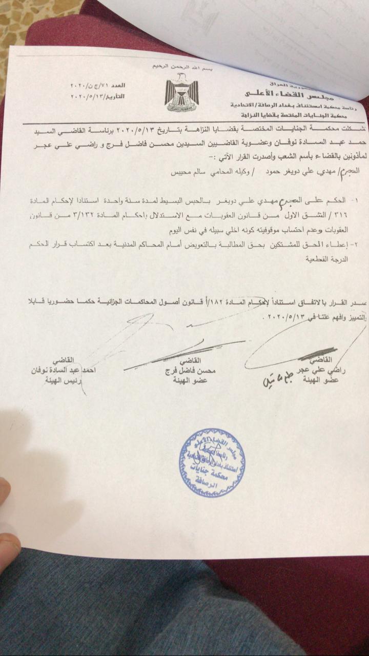 أصدرت رئاسة محكمة استئناف بغداد/ الرصافة الاتحادية، قراراً بالحبس لمدة عامين على رئيس اتحاد المواي تاي السابق مهدي علي دويغر بتهمة اختلاس الأموال.