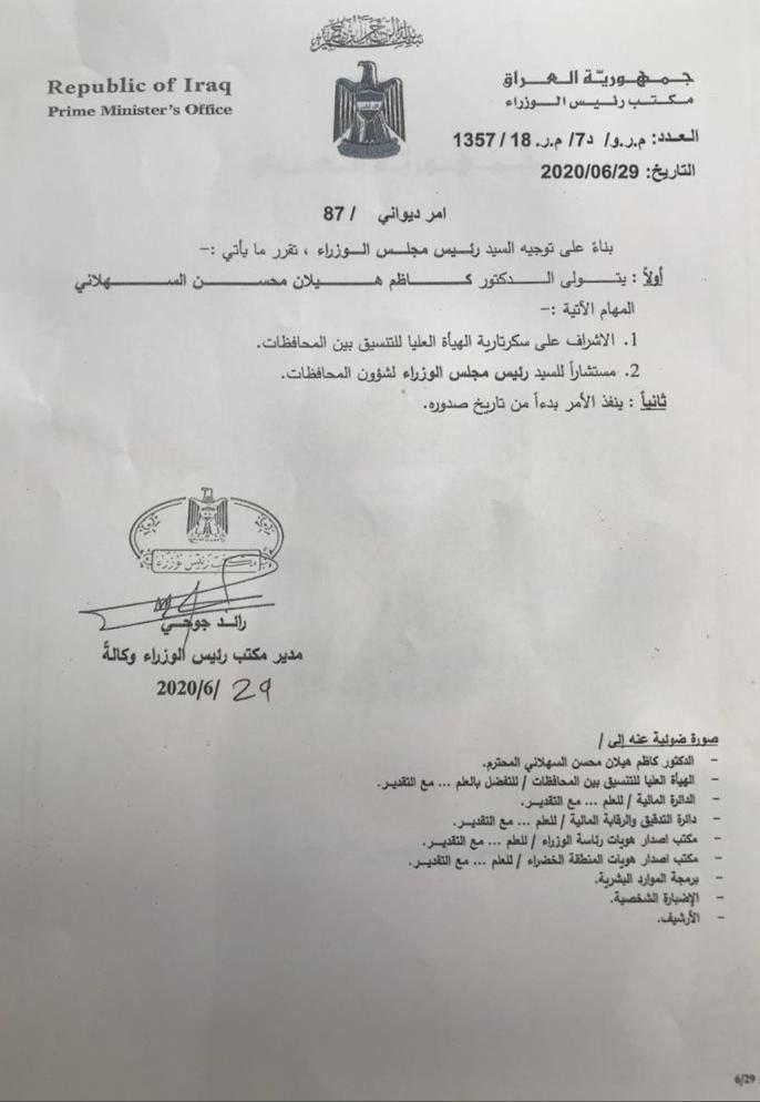 الكاظمي يكلف كاظم السهلاني مستشارا لشؤون المحافظات