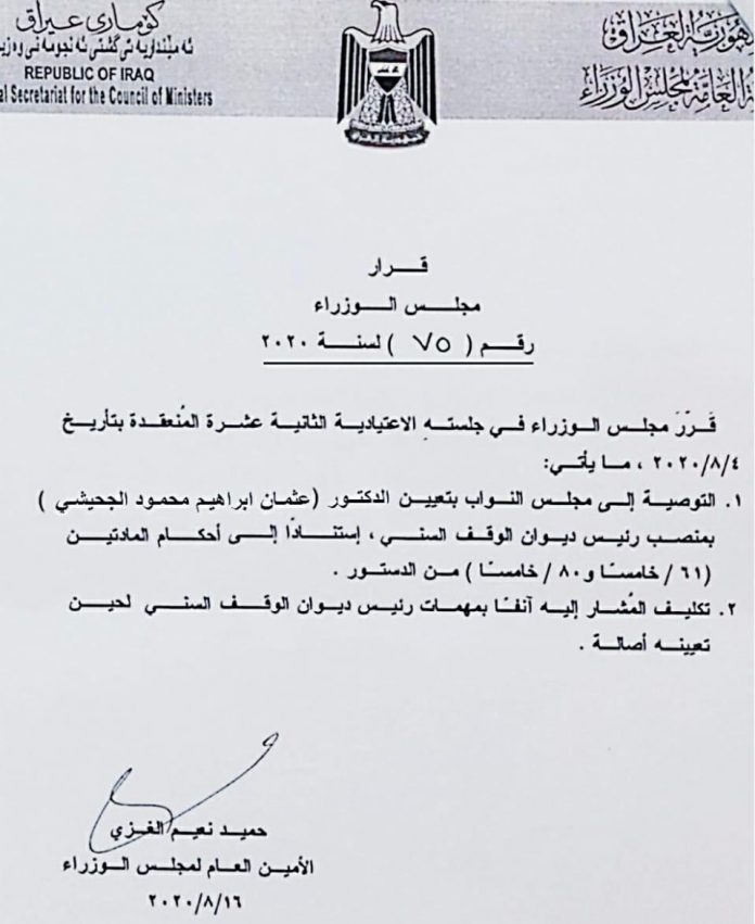 بالوثيقة.. تكليف النائب السابق عثمان الجحيشي برئاسة الوقف السني