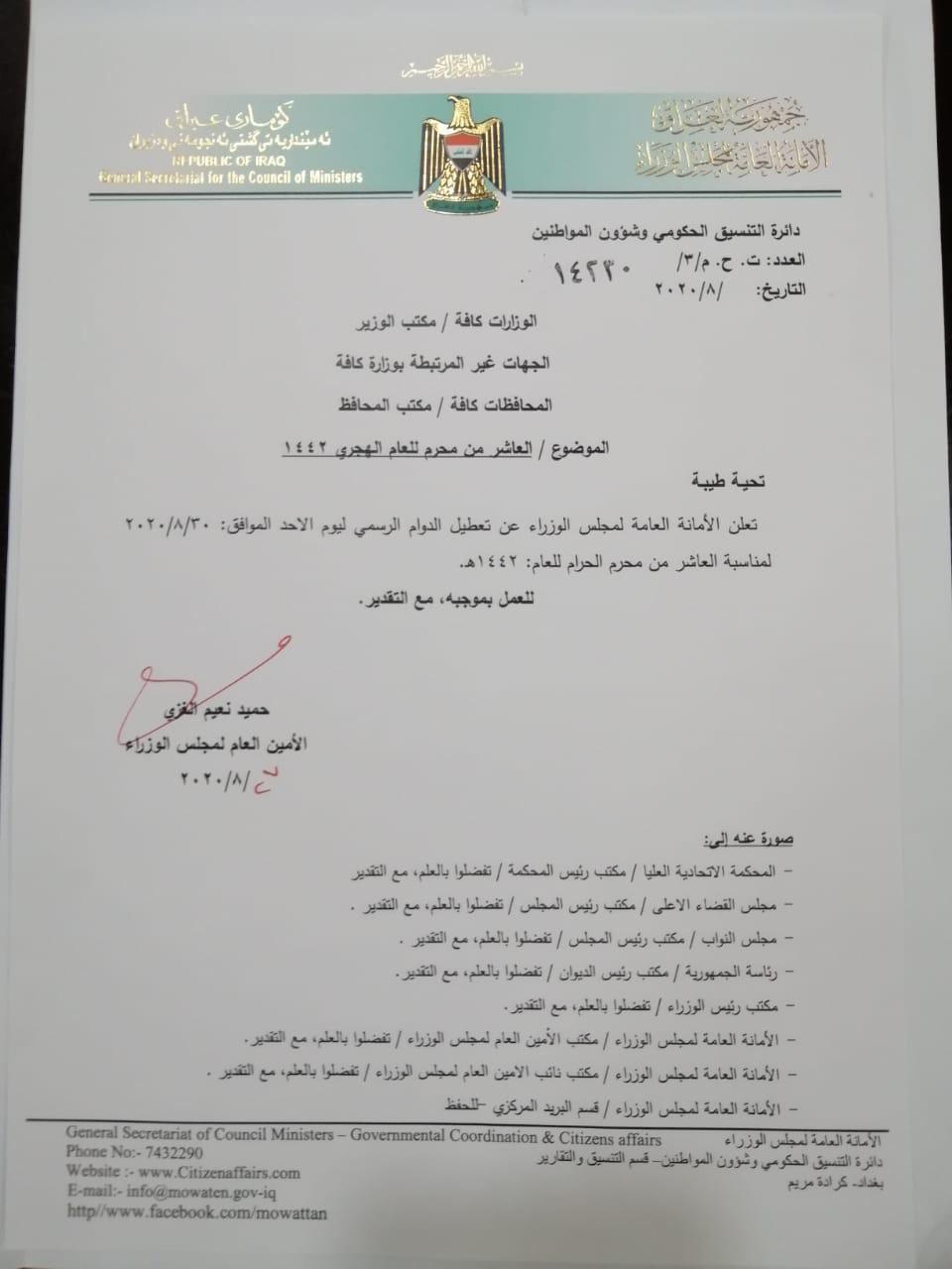 بالوثيقة.. تعطيل الدوام الرسمي ليوم الاحد المقبل بمناسبة العاشر من محرم الحرام