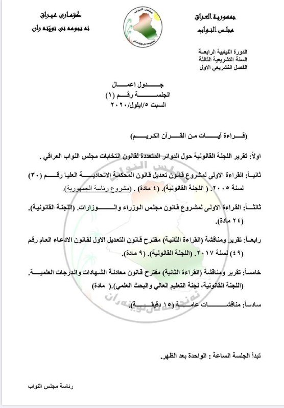 نشرت وثيقة صادرة من مجلس النواب تتضمن جدول اعمال المجلس لجلسة السبت المقبل بعد استئناف فصله التشريعي