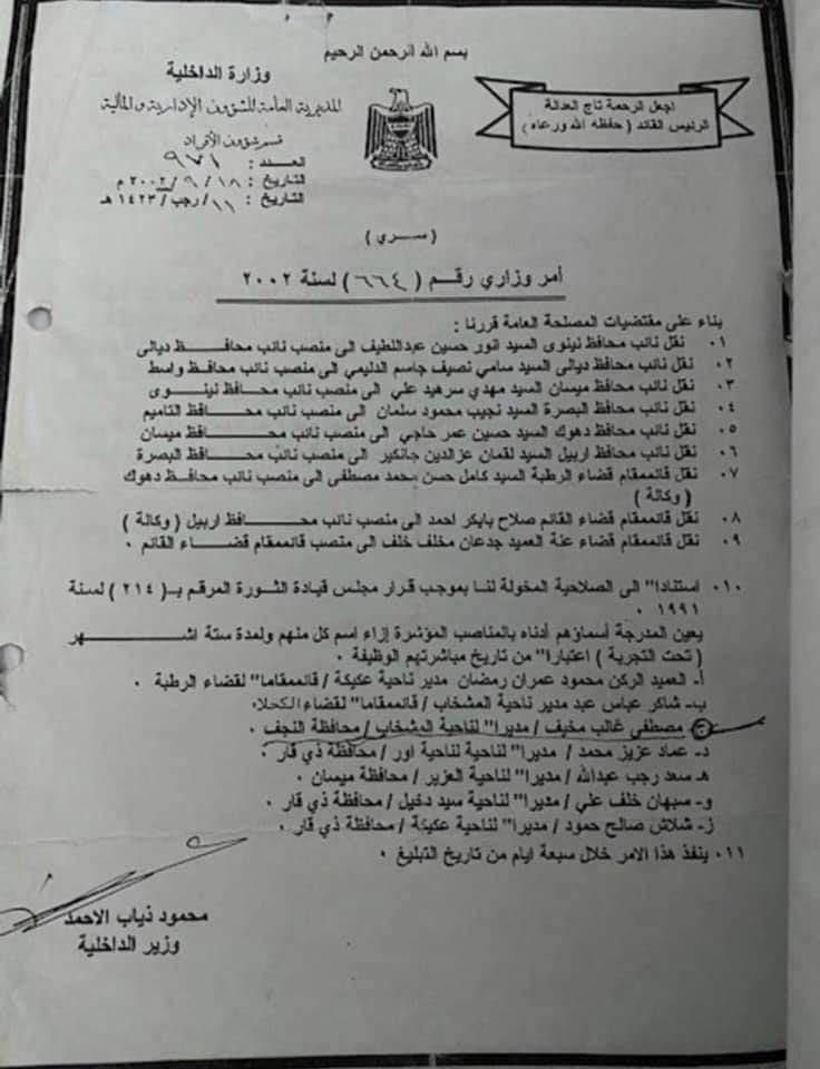 وبحسب الوثيقة فان مخيف قد عين لمدة ستة اشهر تحت التجربة بامر وزاري عام 2002 وقد وقع على هذا الامر المجرم الهارب محمود ذياب الاحمد حيث كان يشغل منصب وزيرا للداخلية في ذلك الوقت