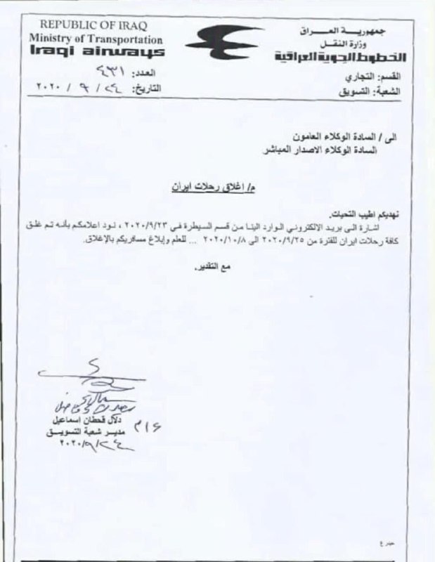 :o:بالوثيقة : الخطوط الجوية العراقية تغلق كافة رحلات ايران بدءا من يوم غد لغاية الثامن تشرين الاول المقبل.