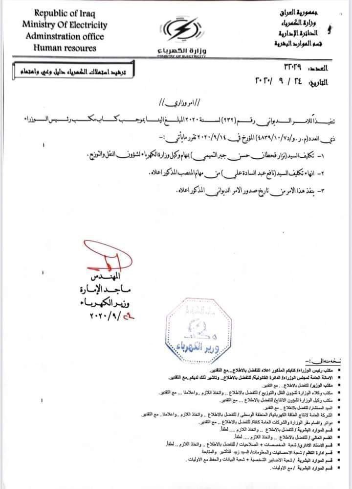 بالوثيقة : وزير الكهرباء ينهي تكليف "نافع عبد السادة" من منصب وكيل الوزارة لشؤون النقل والتوزيع ويكلف بديلاً له.