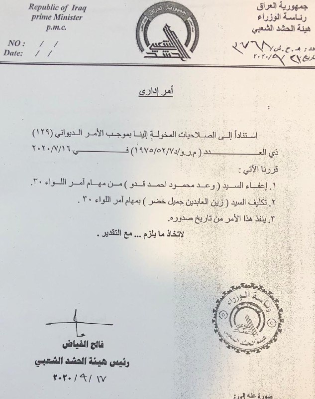 بالوثيقة : رئاسة هيئة الحشد الشعبي تعفي "وعد قدو" و " حامد الجزائري" من مهام آمرية الألوية 30 و 18 و تكلف بدلاء عنهم.