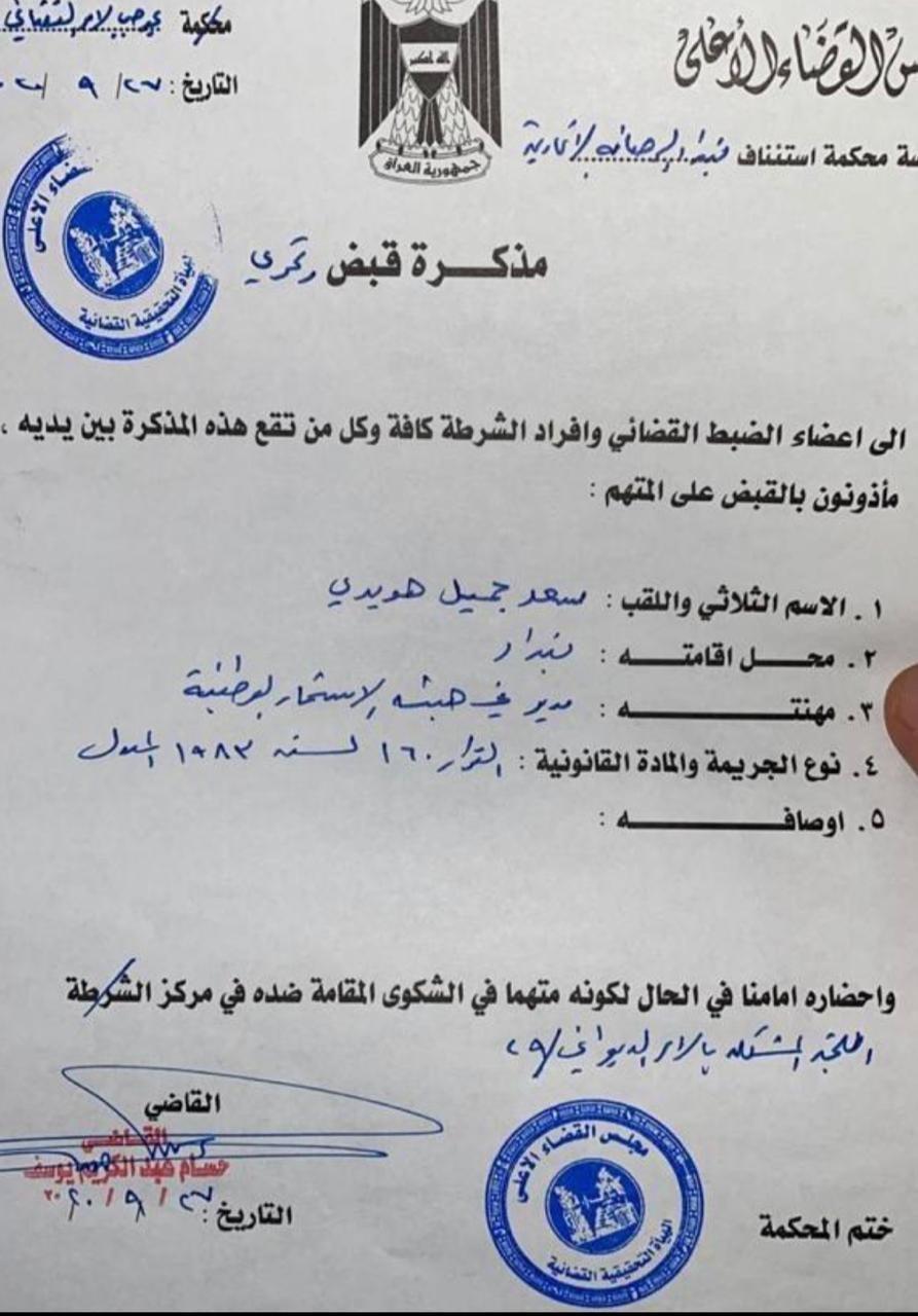 نشرت اليوم الاثنين، وثيقة امر قبض صادرة من مجلس القضاء الاعلى بحق مدير في هيئة الاستثمار الوطنية.