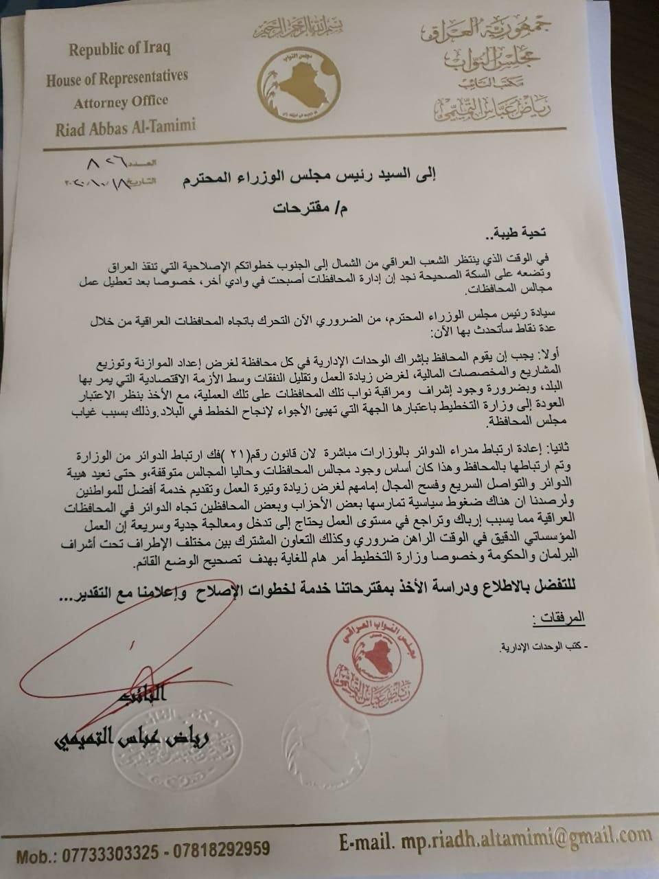 بالوثيقة.. نائب يقدم مقترحين الى رئاسة الوزراء بشأن إدارة المحافظات