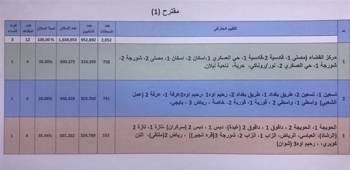 نشرت وثيقة تتضمن احد المقترحات المطروحة لتقسيم الدوائر الانتخابية في محافظة كركوك.