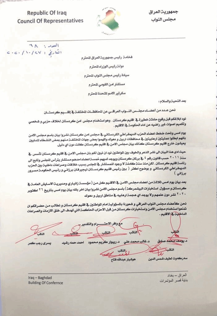 وجه سبعة نواب كرد، اليوم الثلاثاء، مخاطبة إلى الرئاسات الثلاث ومستشار الأمن القومي وسكرتير الأمم المتحدة، حذروا فيها من وقوع ما سموها "حادثة خطيرة" في إقليم كردستان.