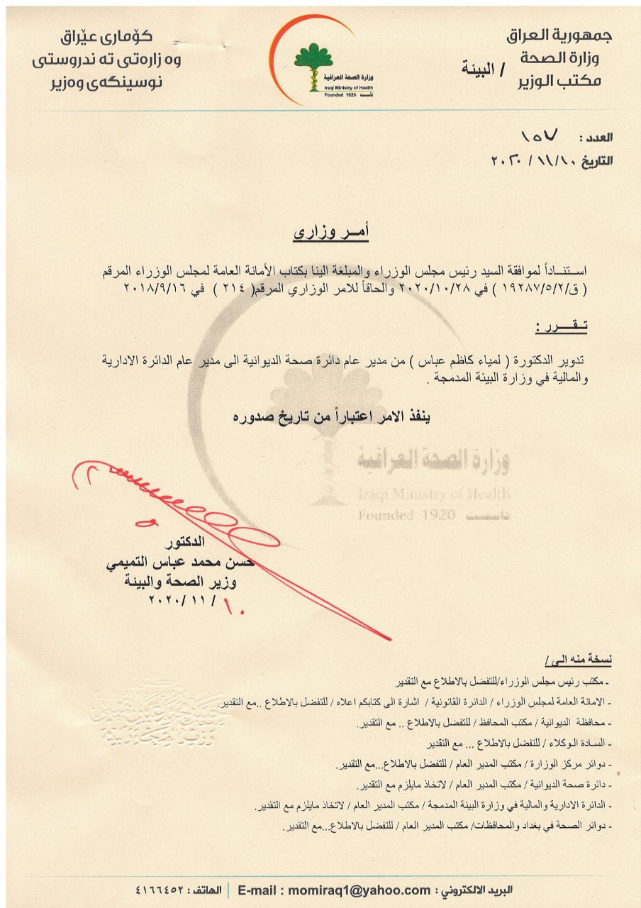 بالوثيقة .. إعفاء مدير عام صحة الديوانية لمياء كاظم