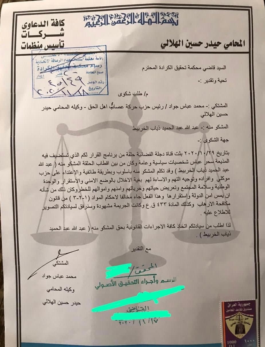 بالوثيقة.. عصائب اهل الحق ترفع دعوى قضائية ضد النائب عبد الله الخربيط