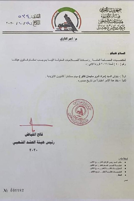 بالوثيقة :::رئيس هيئة الحشد الشعبي يعين مستشار للشؤون الايزيدية.