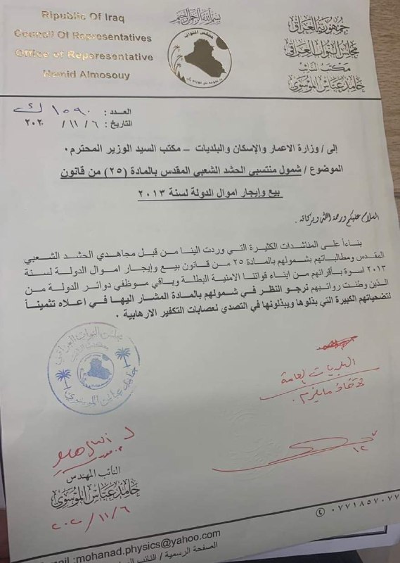 النائب حامد الموسوي يستحصل موافقة وزارة الاعمار والاسكان والبلديات على شمول منتسبي الحشد الشعبي لمقدس الموطنة رواتبهم بالتقديم على قطع الأراضي السكنية