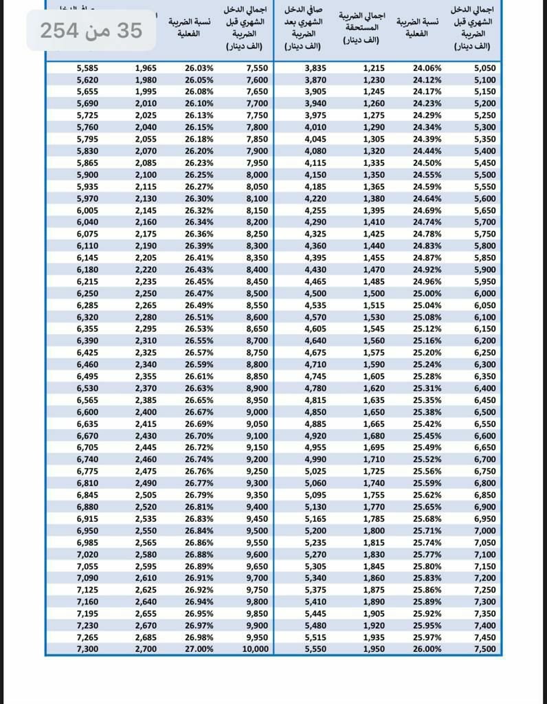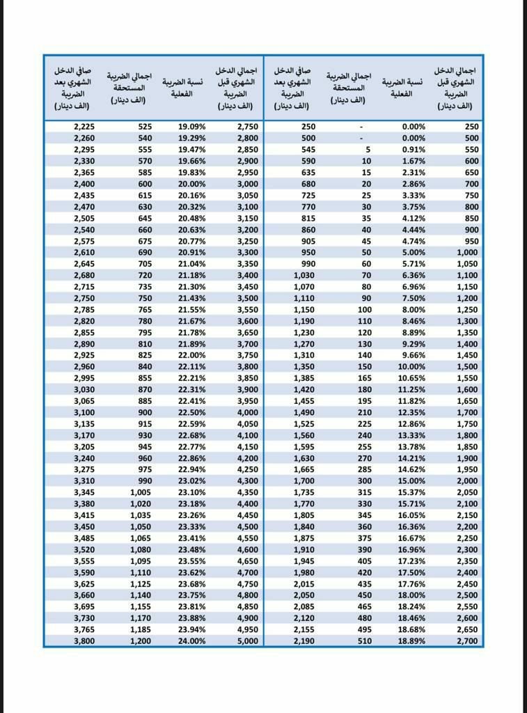 نشرت وثيقة تبين نسبة الضريبة المفروضة على رواتب الموظفين ضمن مشروع قانون الموازنة المالية العامة لعام 2021، الذي وصل إلى مجلس النواب في وقت سابق من اليوم الثلاثاء.