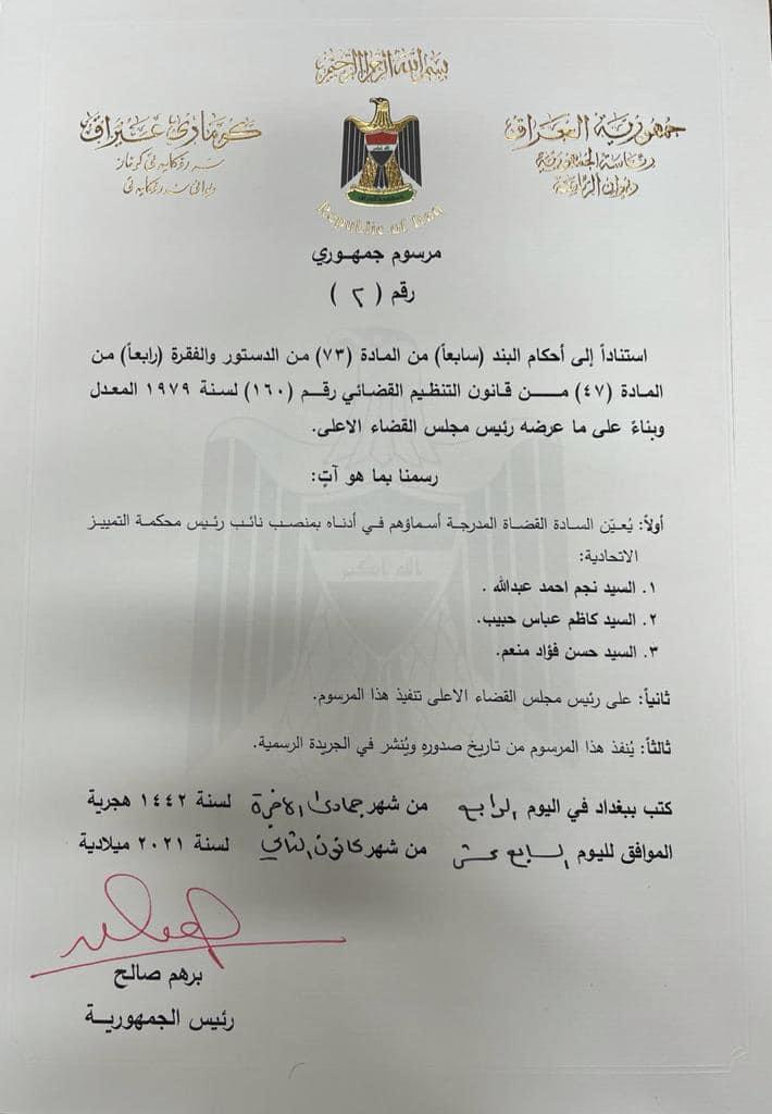 قرر ديوان رئاسة الجمهورية،، تعيين ثلاثة قضاة بمنصب نائب رئيس محكمة التمييز الاتحادية.