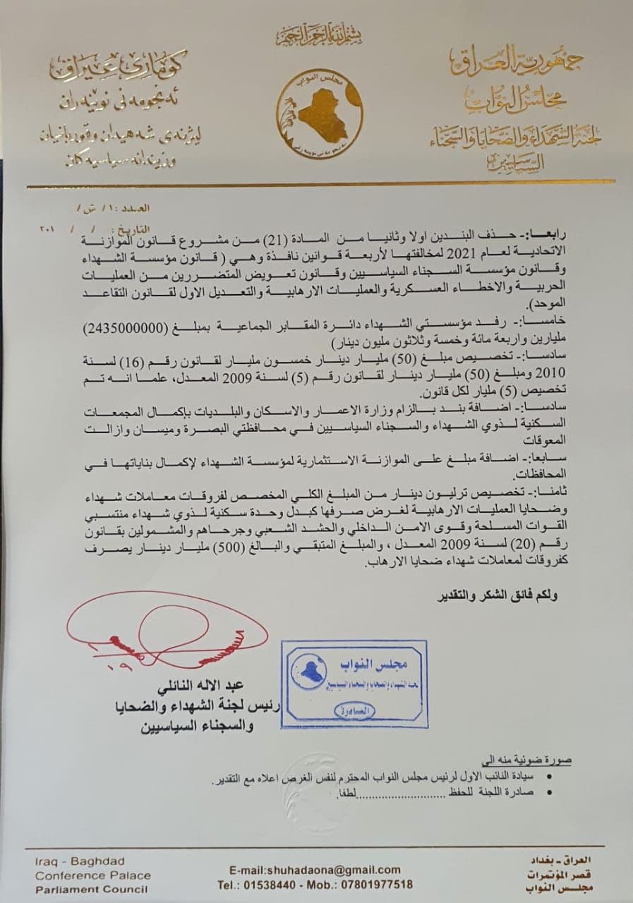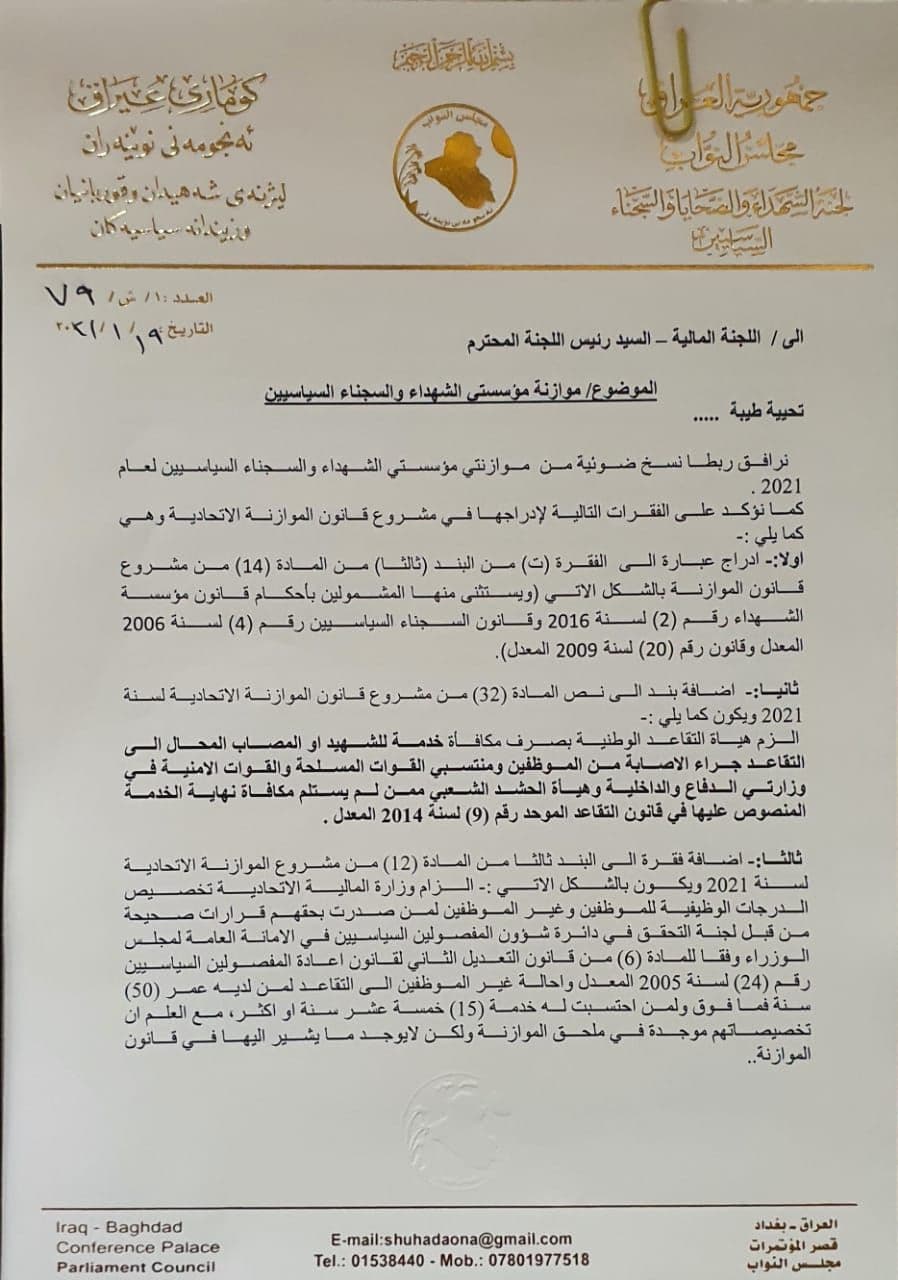 بالوثيقة مجلس محافظة بغداد يوجه كتابًا رسميًا الى رئيس مجلس الوزراء لتعيين ذوي الشهداء من طلبة الكلية العسكرية المستشهدين أثناء أداء الواجب الوطني.
