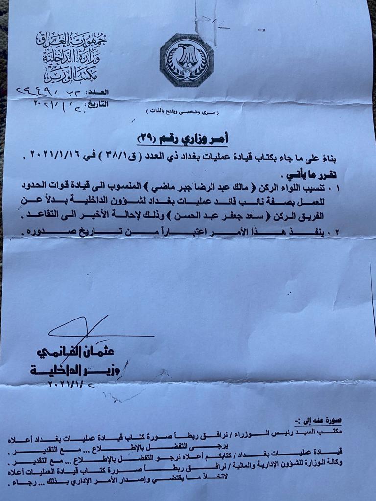 بالوثيقة.. تكليف اللواء الركن مالك عبد الرضا بمنصب نائب قائد عمليات بغداد