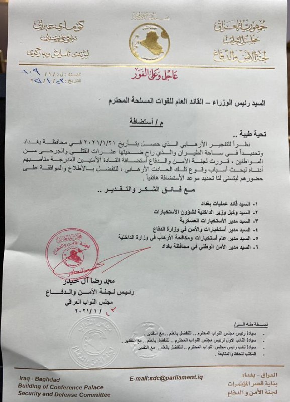 بالوثيقة : الأمن النيابية تخاطب الكاظمي لاستضافة القادة الأمنيين للتحقيق بتفجيري ساحة الطيران.