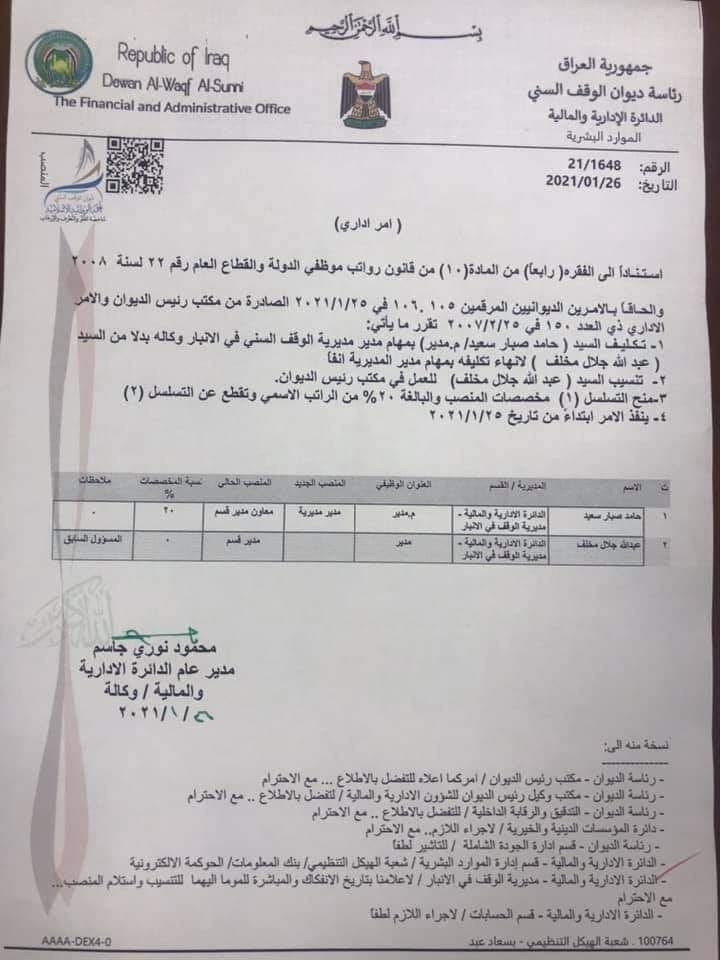 بالوثيقة.. تعيين مدير جديد للوقف السني في الانبار