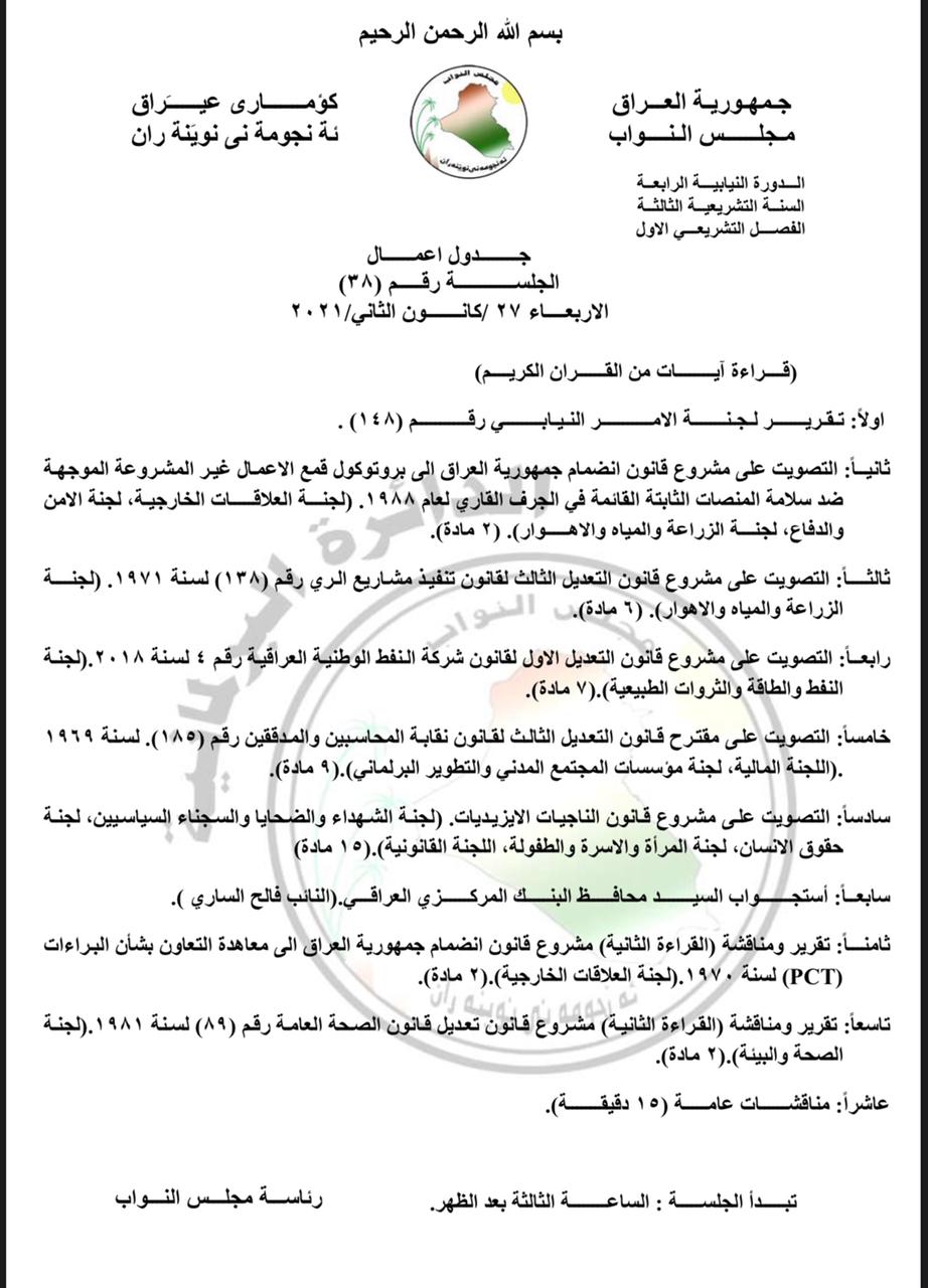 جدول اعمال جلسة البرلمان ليوم غد