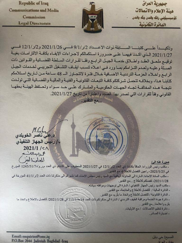 بالوثيقة ... هيئة الاعلام والاتصالات تمنع بث الـ4G عن شركة اسيا سيل بسبب عدم تسديد ديونها