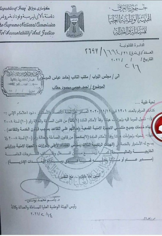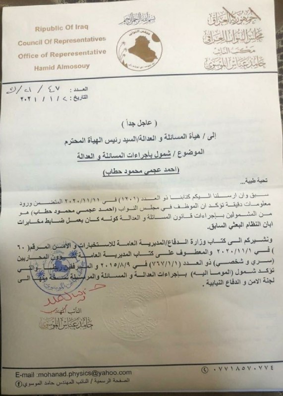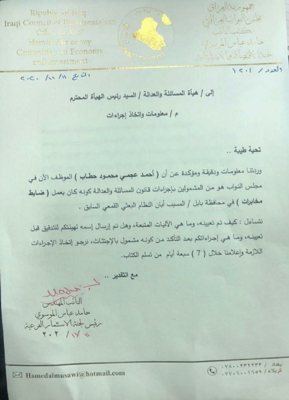 النائب حامد الموسوي يكشف موظفاً تم تعيينه في مجلس النواب العراقي مستشارا بدرجة خاصة كان في زمن النظام السابق مدير عام في جهاز المخابرات الصدامي المجرم