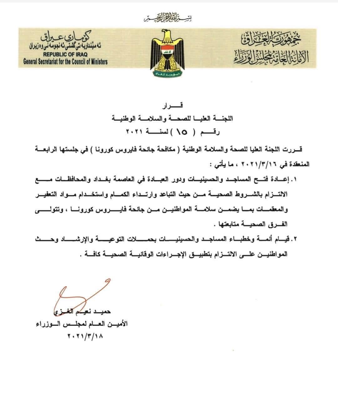 نشرت وثيقة حكومية تتضمن قراراً للجنة الصحة والسلامة بإعادة افتتاح دور العبادة في بغداد والمحافظات.