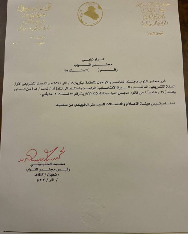 بالوثيقة : قرار مجلس النواب باعفاء رئيس هيئة الاعلام و الاتصالات علي الخويلدي من منصبه.