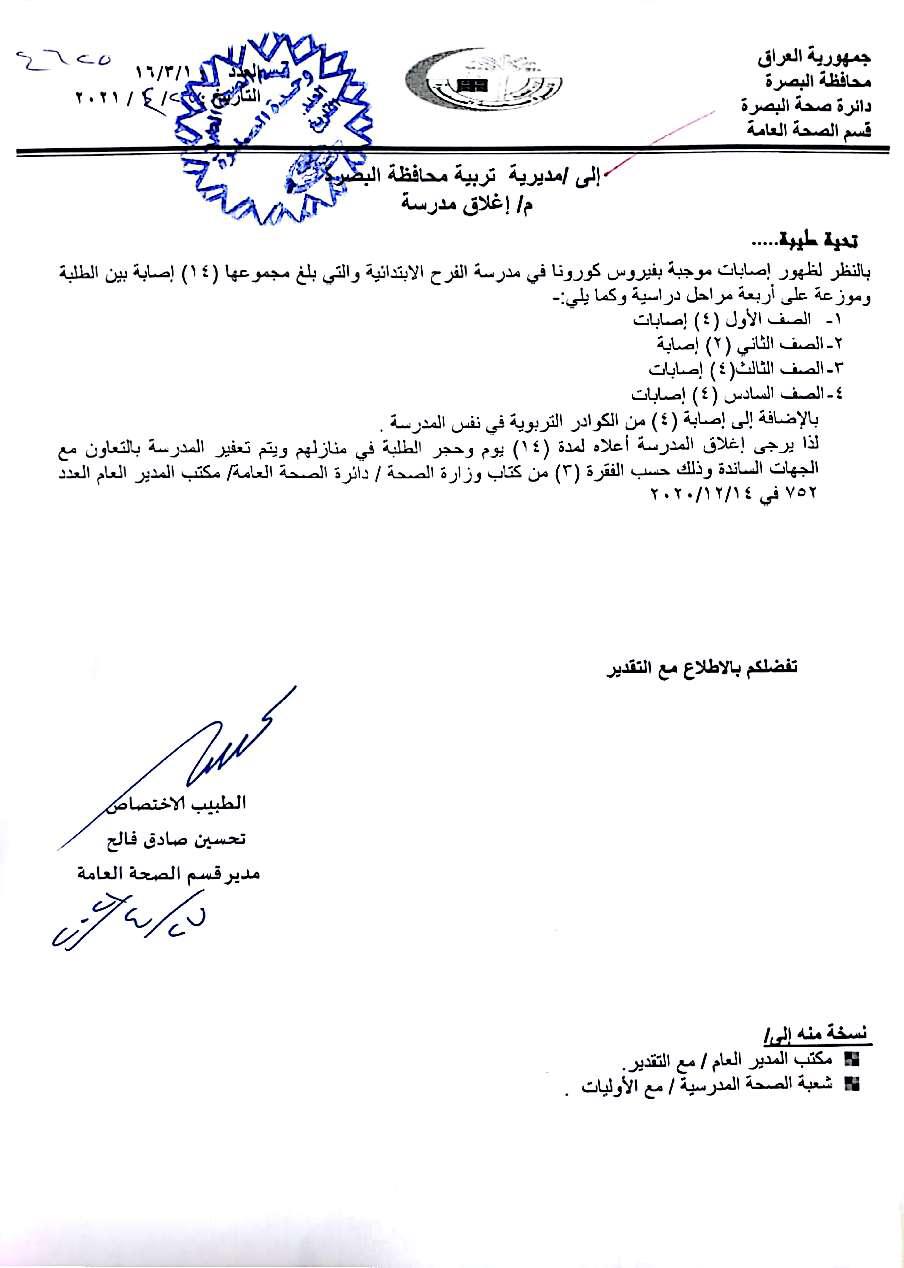دعا مدير قسم الصحة العامة في دائرة صحة البصرة مديرية تربية المحافظة باغلاق مدرسة الفرح الابتدائية على خلفية تسجيلها اربعة عشر اصابة بفايروس كورونا بين طلابها وكوادرها التعليمية.