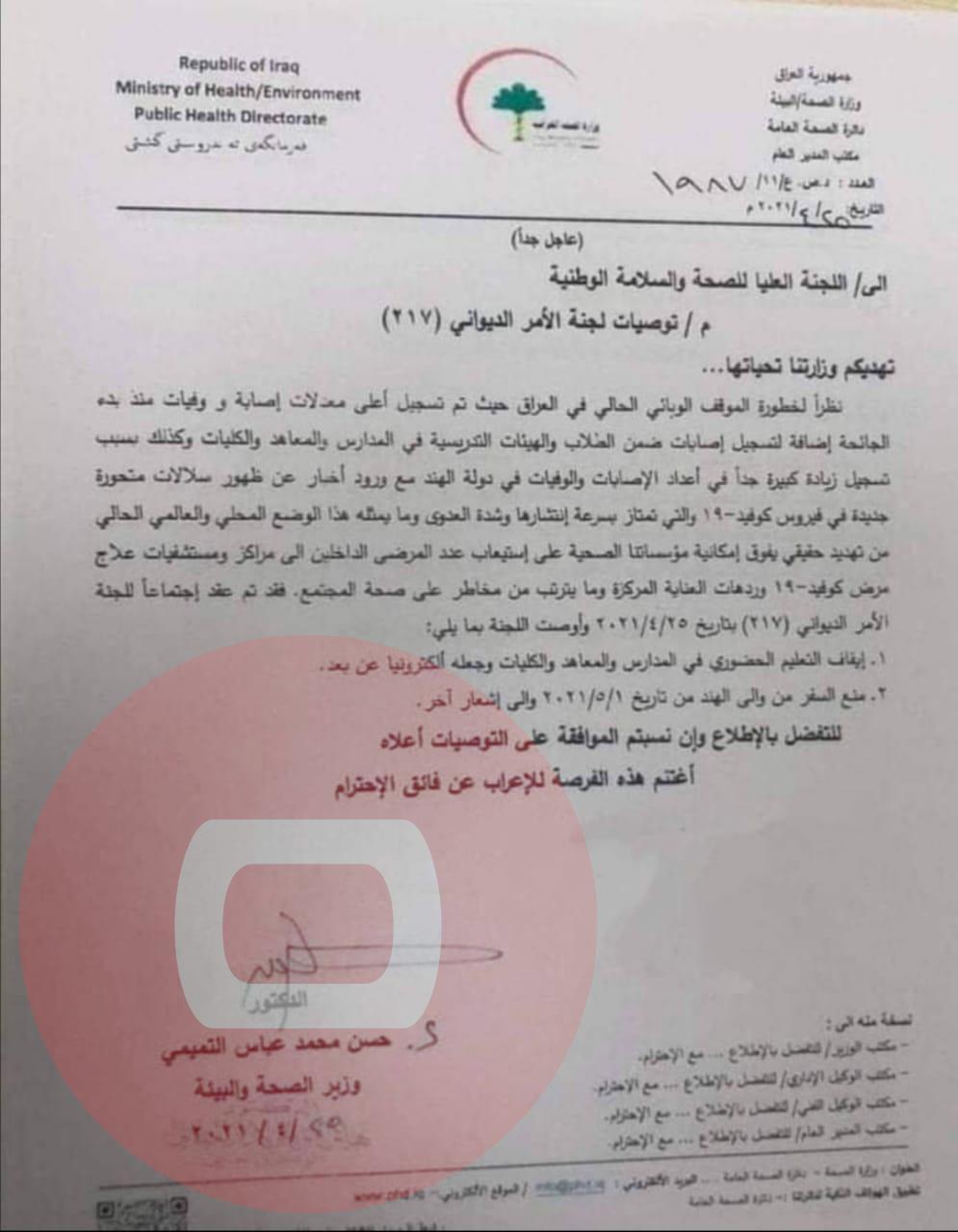 وتبين الوثيقة المنشورة في ادناه والمرسلة بتاريخ 25 نيسان، تقديم طلب بتعليق الدوام الحضوري وجعله الكترونيا عن بعد، خوفا من تفشي السلالة الهندية الخطرة.