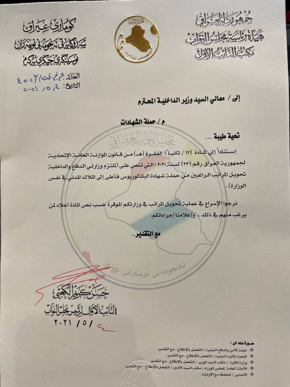 بالوثيقة.. رئاسة البرلمان تدعو وزارتي الداخلية والدفاع إلى الإسراع بتحويل المراتب من حملة الشهادات إلى الملاك المدني