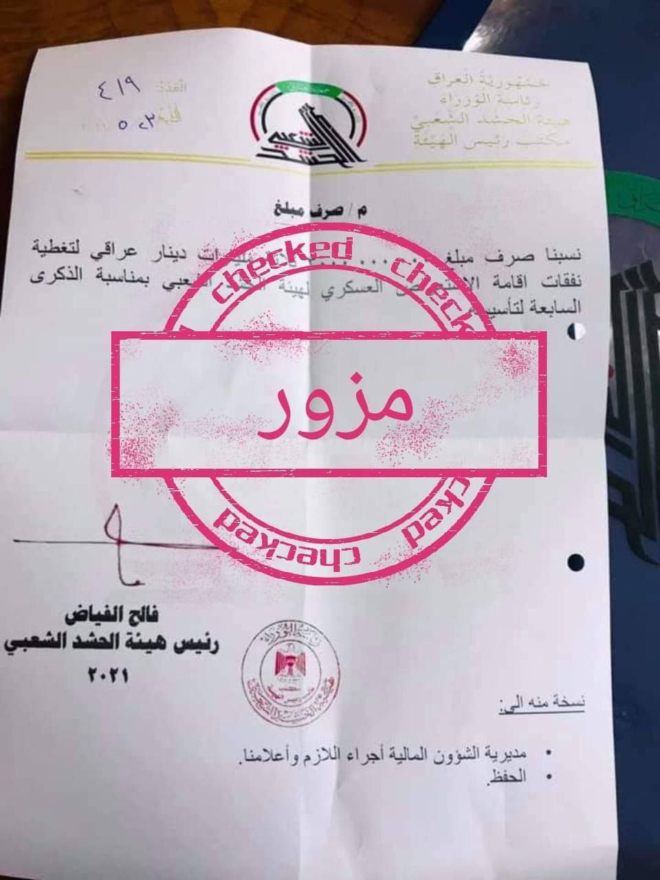 بالوثيقة :::: الحشد الشعبي ينفي صرف مبلغ 3 مليارات دينار لتغطية الاستعراض العسكري لهيئة الحشد الشعبي بمناسبة الذكرى السابعة لتأسيسه .