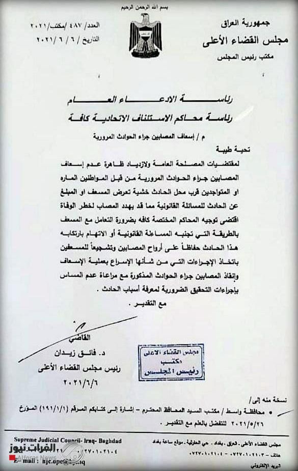 بالوثيقة مجلس القضاء العراقي يصدر قراراً بمنع المسائلة القانونية للمسعف في الحوادث المرورية مع عدم المساس بإجراءات التحقيق.