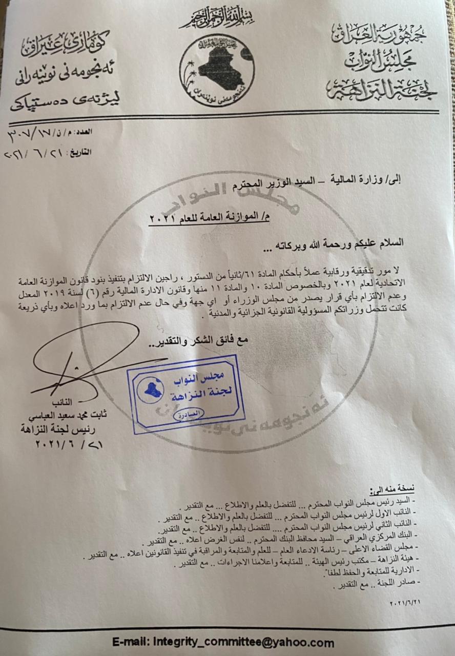 خاطبت لجنة النزاهة البرلمانية، اليوم الثلاثاء، وزير المالية علي علاوي، بشأن تطبيق مواد الموازنة المتعلقة بمستحقات اقليم كردستان.