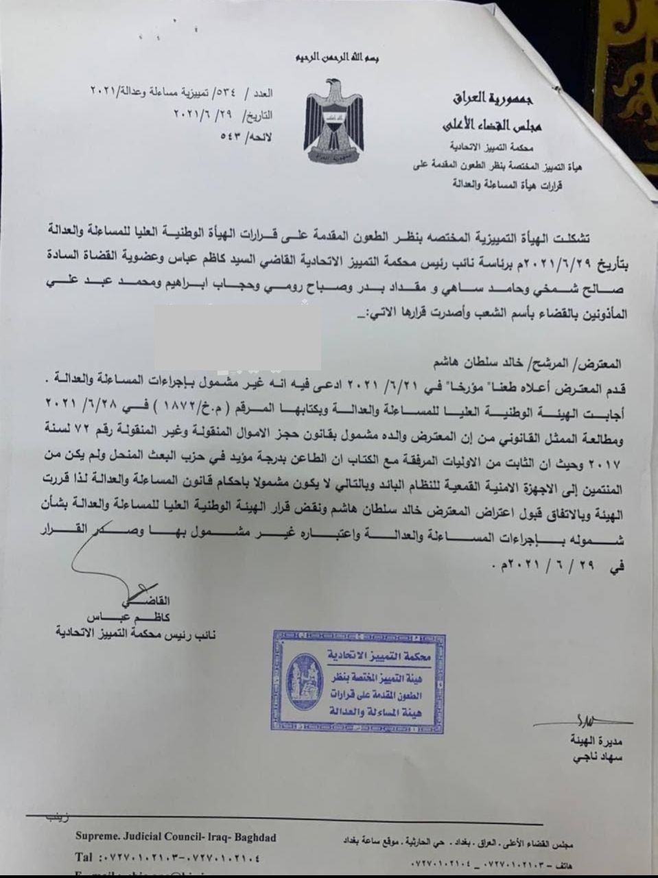 القضاء ينقض قرار أستبعاد نجل وزير الدفاع ومحافظ نينوى بالبعث المجرم سلطان هاشم أحمد من الإنتخابات المقبلة