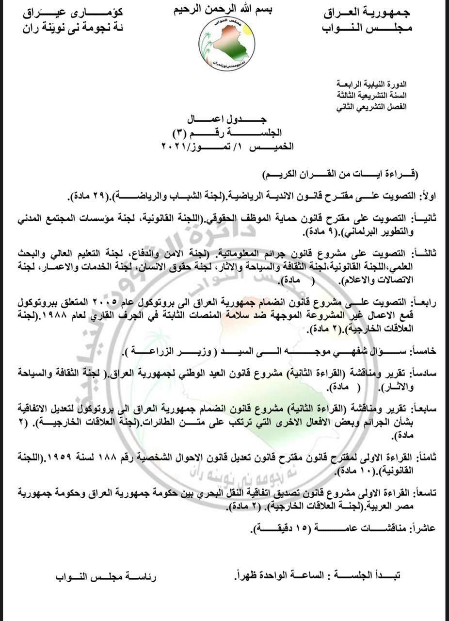 جدول أعمال جلسة البرلمان يوم غد الخميس.