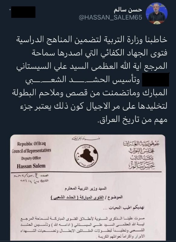 النائب حسن سالم يُعلن مخاطبة وزير التربية لتضمين المناهج الدراسية فتوى الجهاد الكفائي والحشد الشعبي.